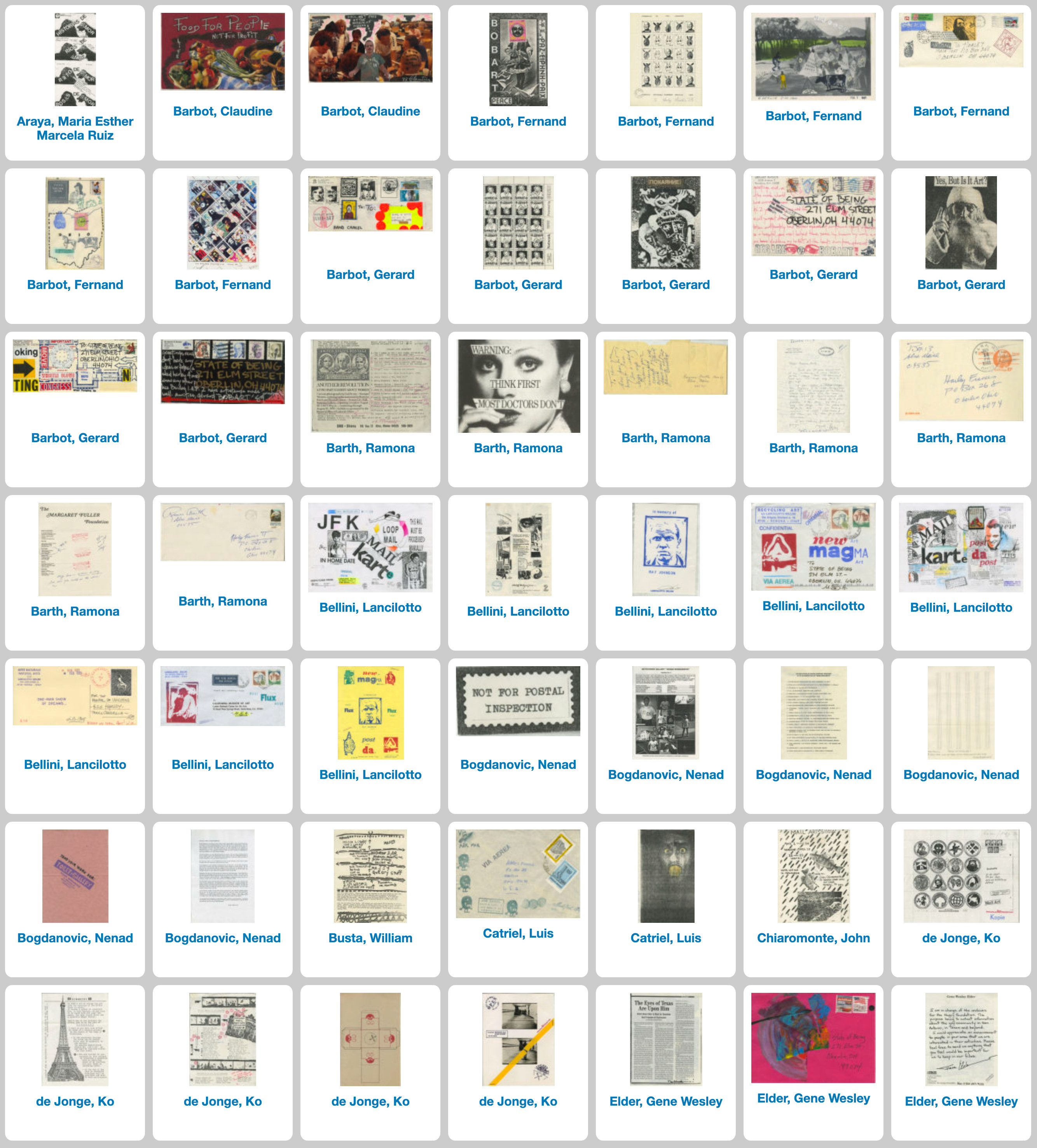 The online exhibition covers the years 1977 to 2004 and features approximately 1,000 works by 35 artists, including Lancillotto Bellini, Claudine Barbot, Dick Higgins, Hazel Jones & Michael Leigh, Patricia Tavenner, and Chuck Welch.