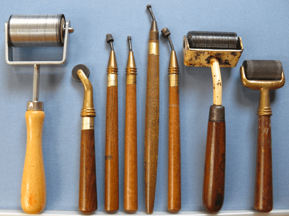 Um Missverstämdnisse auszuschalten, hat Autenrieth die Illustrationen akribisch zusammengesucht, etwa Roulettes, Moulettes und Granierwalzen (Bild: Toni Pecoraro / Public Domain). Wo er nichts fand, hat er selbst Skizzen angefertigt.