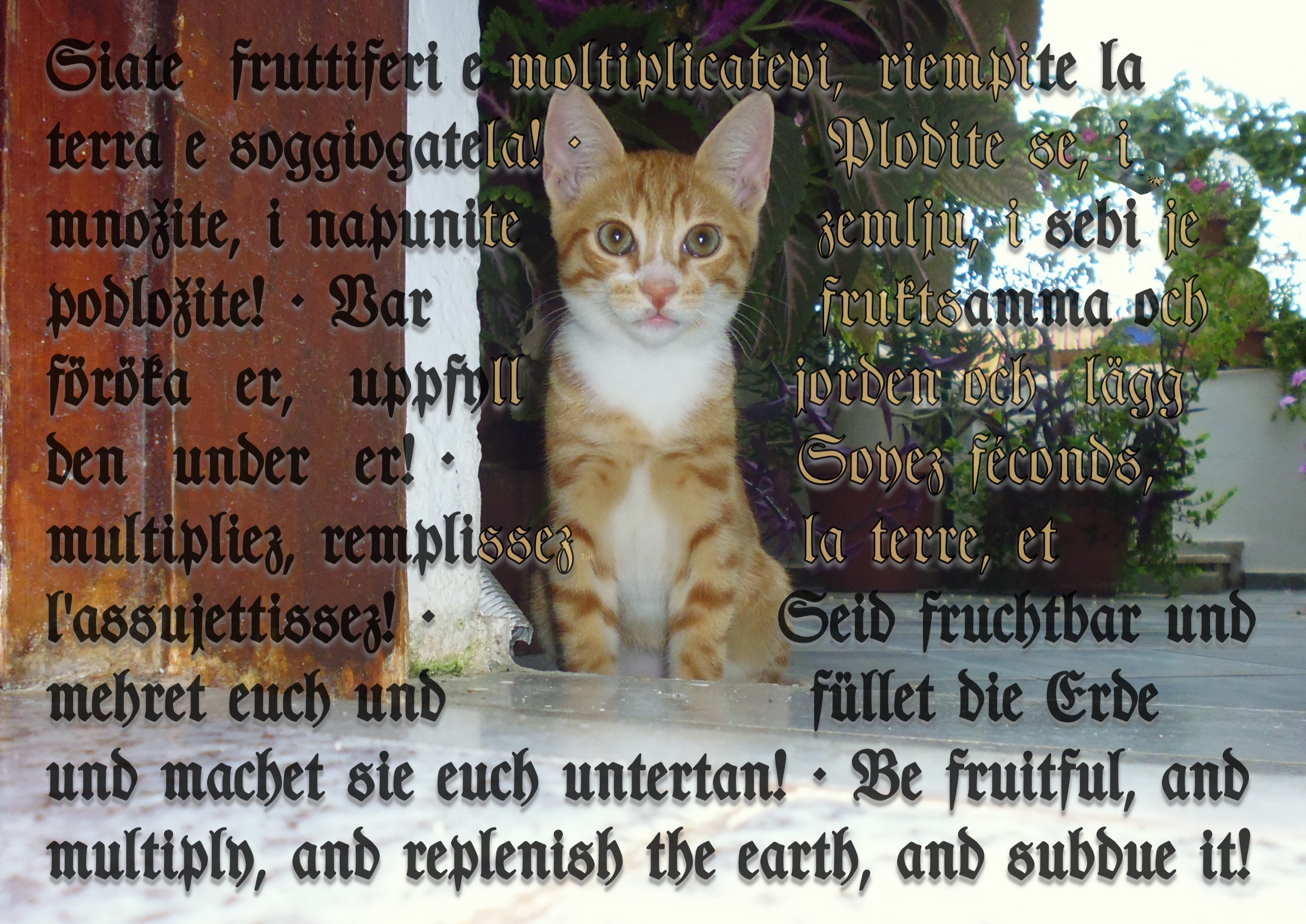 Gerald Jatzek’s contribution quotes the biblical verses “Be fruitful and multiply, and replenish the earth, and subdue it” (Genesis 1.28) in several languages This is contrasted with one of his photographs from Greece, a cat whose gentle gaze recalls the verse “The meek shall inherit the earth” (Matthew 5:5).
