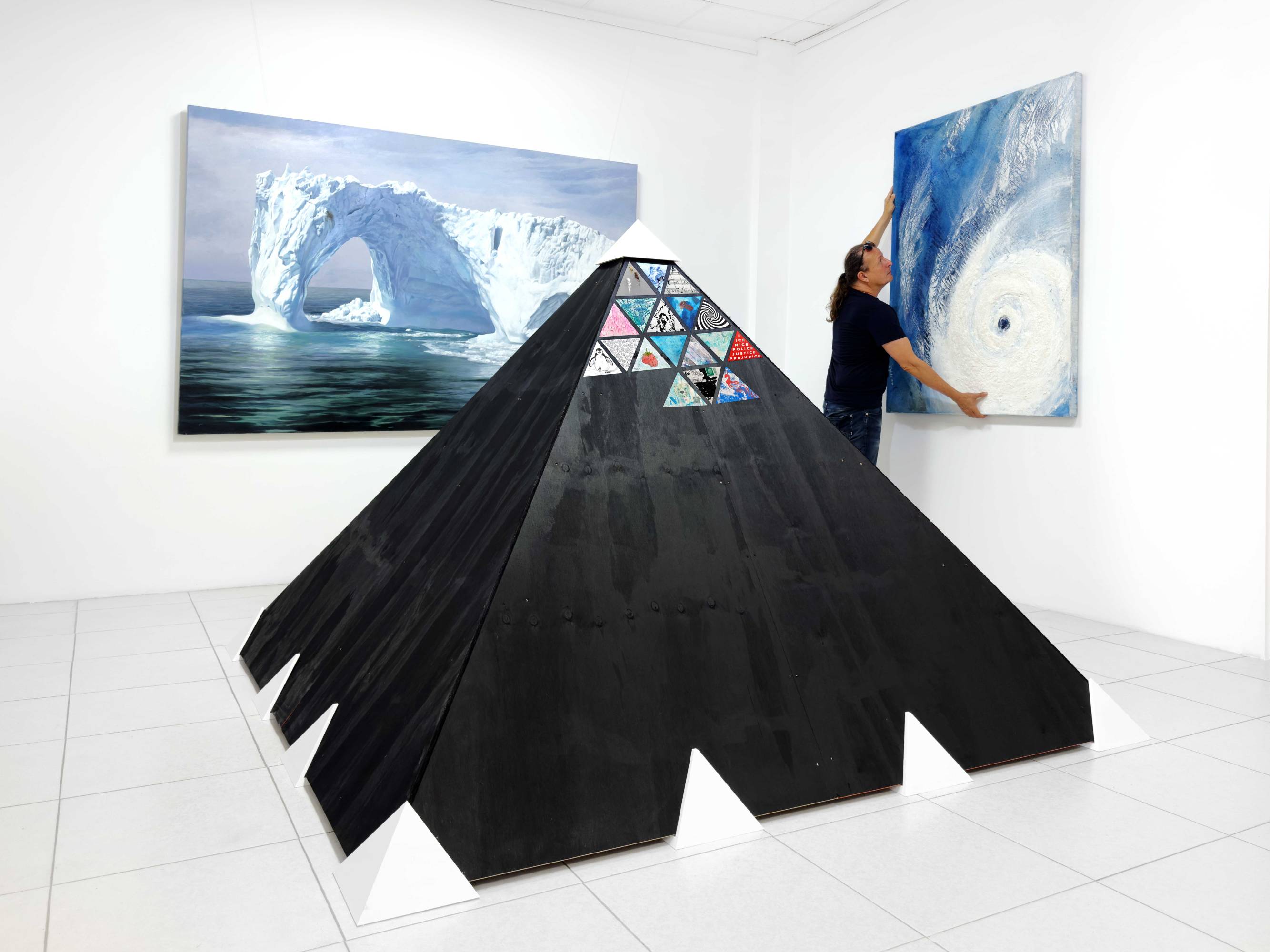 Artists were asked to contribute triangle-shaped works inspired by A23a, the world’s largest iceberg. Over 240 artists from 32 countries responded to the call. Each work represents an individual iceberg segment. Together, the contributions form an interactive iceberg pyramid, a collective sculpture of “awareness, beauty, and change”.
