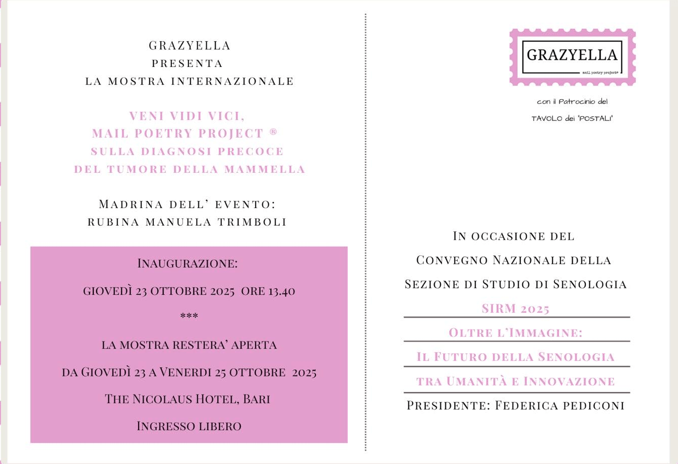 Graziella Di Grezia is a radiologist who also works as a mail artist under the name Grazyella. Combining her interests, she organised an exhibition in October as part of the National Congress of the Breast Imaging Section (SIRM) in Bari. She described it as “a project that combines visual art, poetry, and social commitment, raising awareness through beauty and creativity”.