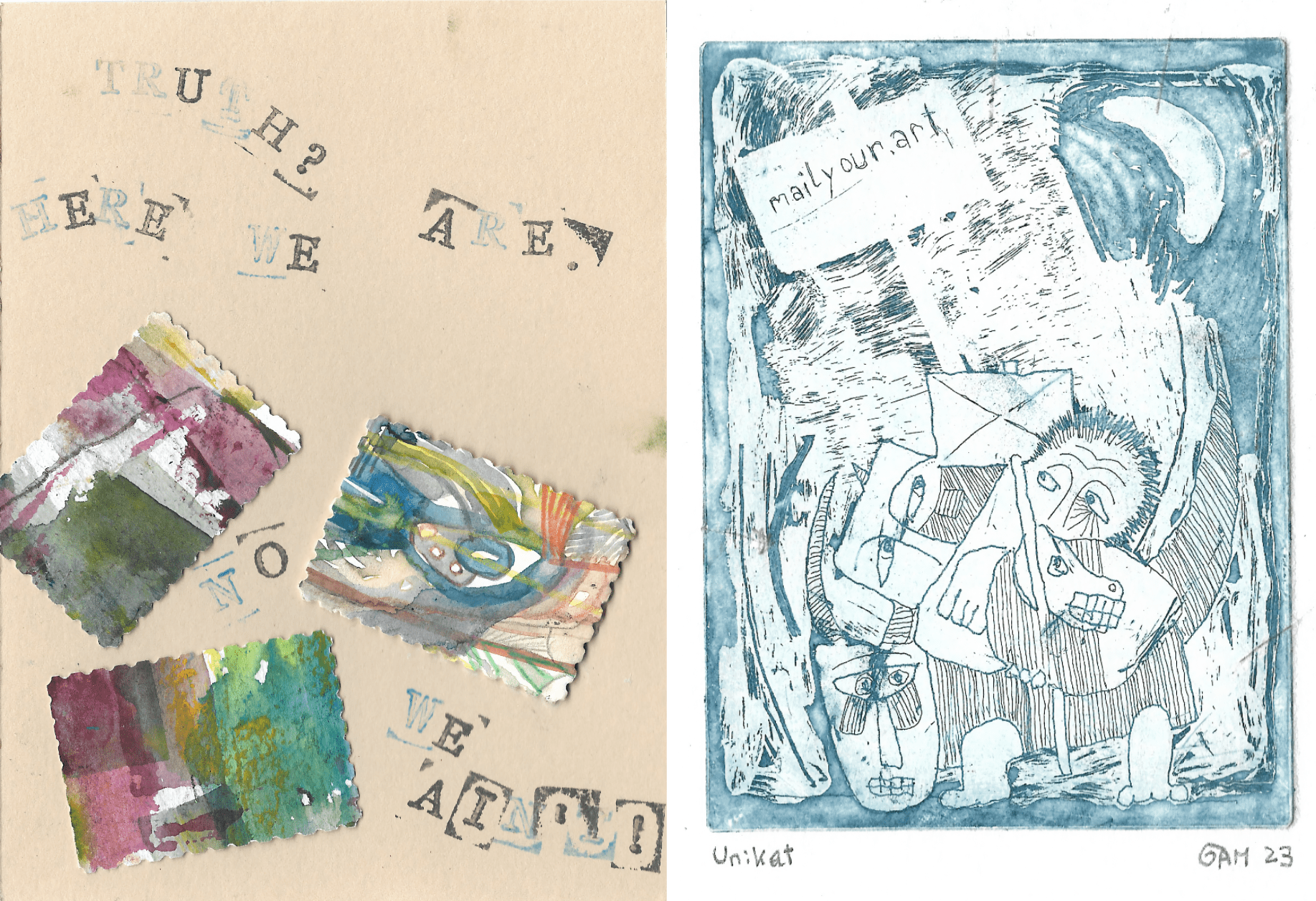 “Mail Art arrived from the Austrian artist couple Gerald Jatzek and Gabriele Müller, a lovely surprise in my mailbox. Gerald sent a 10×15 collage card, rich in details and layers. The composition includes hand-painted artist stamps, and rubber stamps with wordplay that add rhythm and playfulness to the visual experience.”