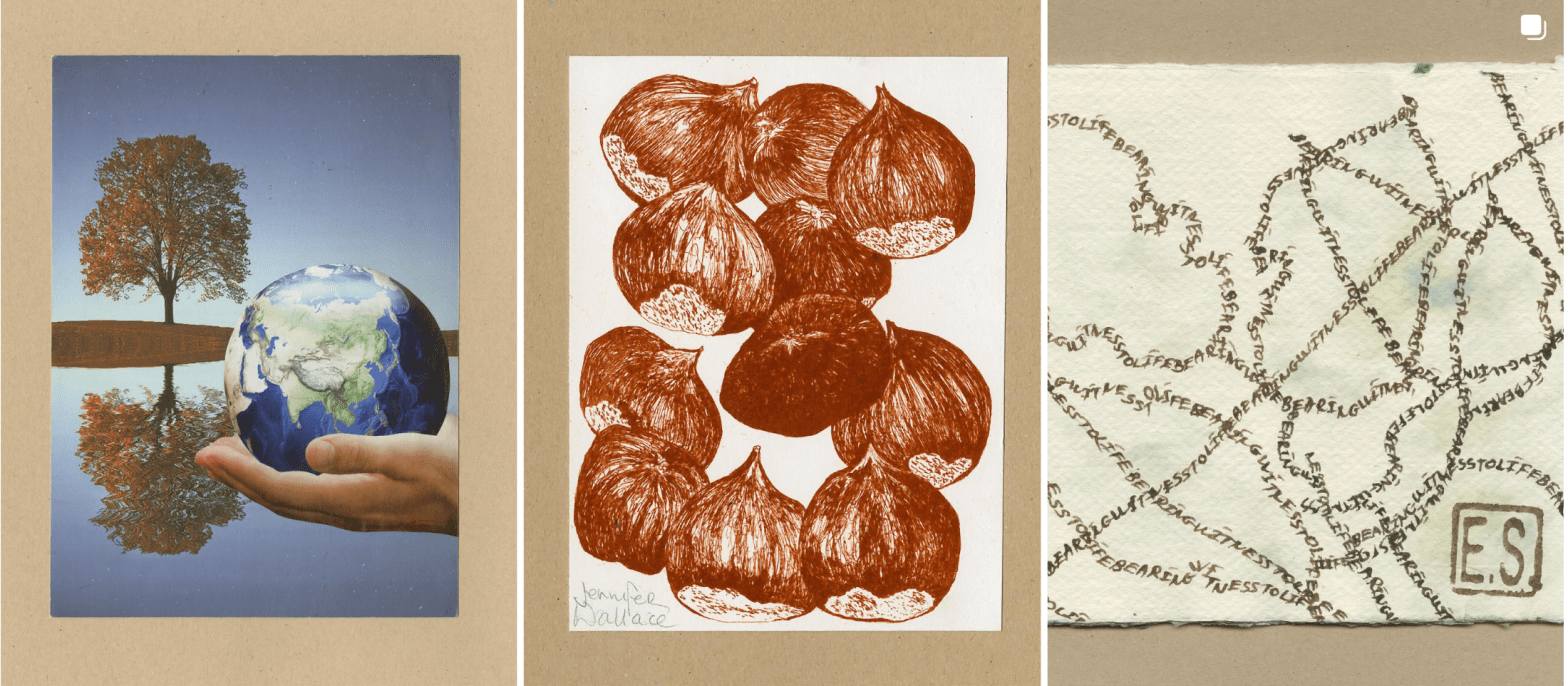The British Reading Agency invited mail artists to respond to “The Overstory” by Richard Powers, a book with nine main characters – although one could argue that the really important beings in the book are not humans, but trees …