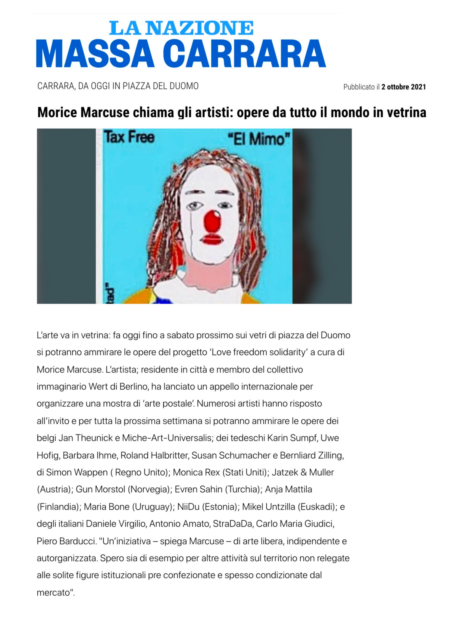 Morice Marcuse is the organizer of a mailart exhibition in shopping windows (l’arte va in vetrina) in the Italian town of Carrara under the title Love – Freedom – Solidarity. He invited artists from all over the place to reflect on the theme contextualizing it in their socio-geographical framework. Gabriele and Gerald contributed the jointContinue reading “Art in the Window”